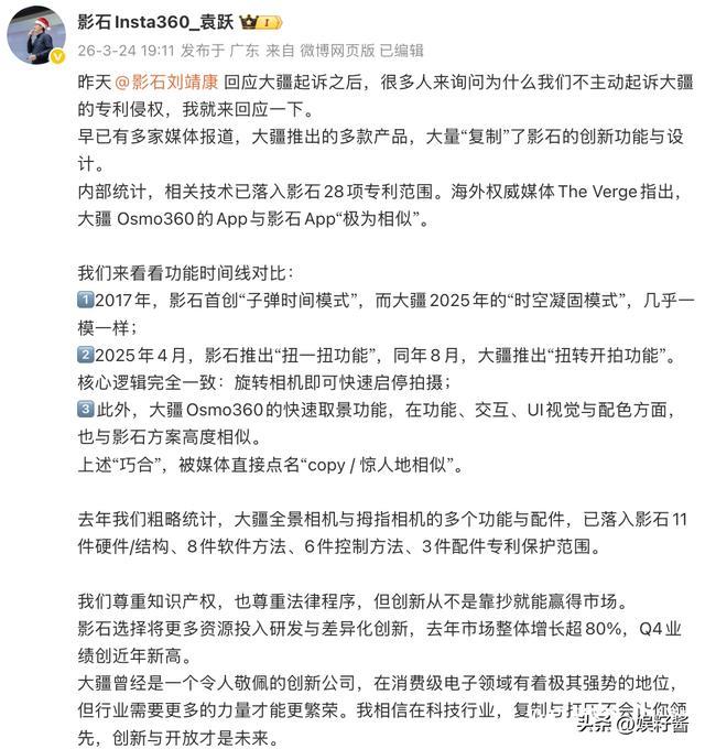 但2025年下半年开始,边界消失了。大疆想切全景相机这块蛋糕,影石想分无人机这杯羹。于是,战争从市场打到价格,从渠道打到供应链,现在终于打到了法庭。
