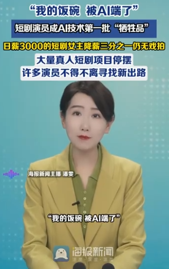 某传媒公司官宣签约两位AI演员、短剧演员成为AI冲击下的“祭品”、真人短剧项目年初集体“腰斩”……3月25日,《海报新闻》以“我的饭碗,被AI端了”为标题,报道了远在横店、郑州等各大影视拍摄基地的演员通告群彻底沉寂,腰部演员、群演、特约演员们集体失业,连日薪数万元的顶流短剧演员片酬也打了对折。